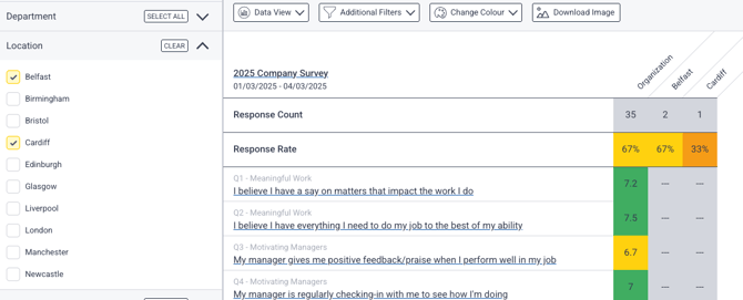 A: If a segment doesn’t meet the organisation’s confidentiality threshold (typically a minimum number of responses), the results data is hidden to protect confidentiality.