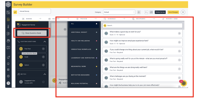 If you have Hive Fives or Open Door turned on for your organisation, you won’t need to manually add these into your survey—as long as the feature is turned on, it’ll be included.